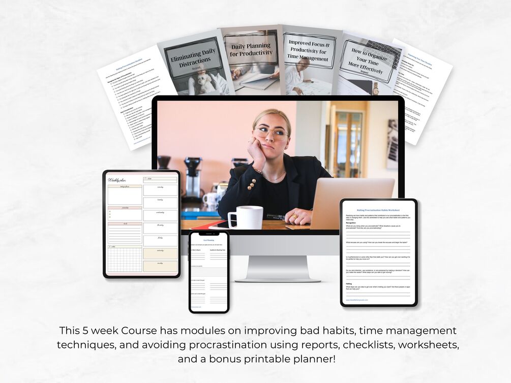 Introducing our 7-module, 5 week course designed to help you boost your productivity and achieve your goals. In this course, you'll learn how to identify and remove bad habits that are holding you back, discover the things that unnecessarily waste your time, and learn how to organize and plan your time effectively.